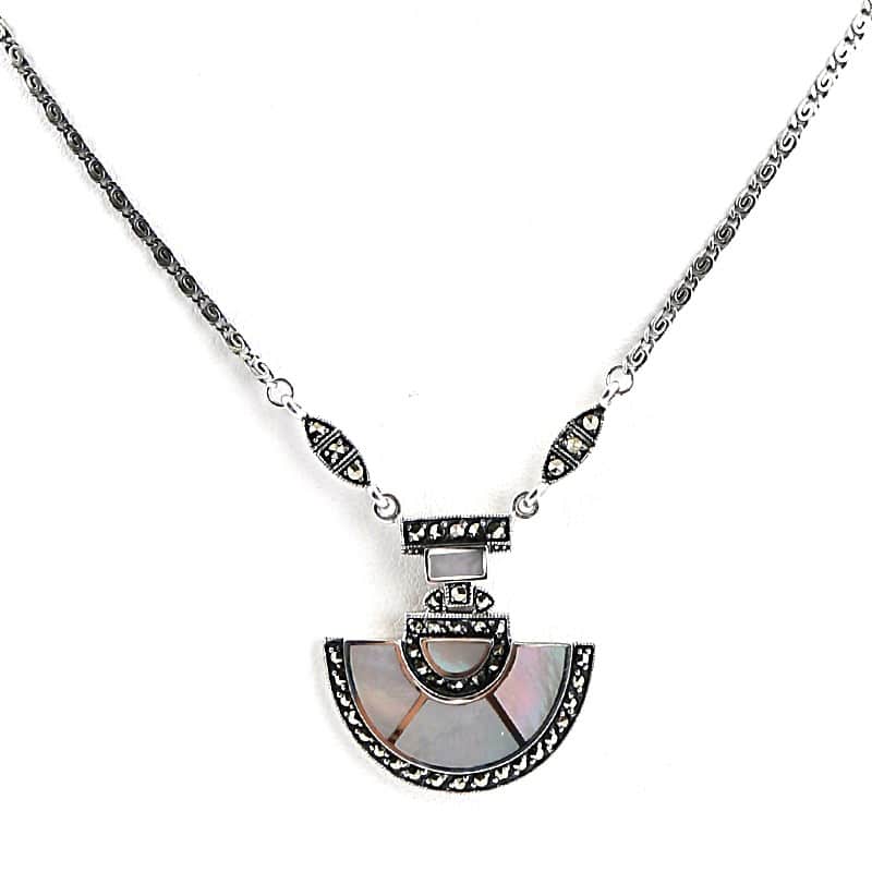 Ce gracieux collier en argent 925 est composé d’une nacre en forme de demi-cercle, surmontée d’une élégante attache mobile. Le pendentif comme l’attache sont délicatement sertis de marcassites, créant un contraste lumineux entre la nacre et les scintillements métalliques des marcassites.