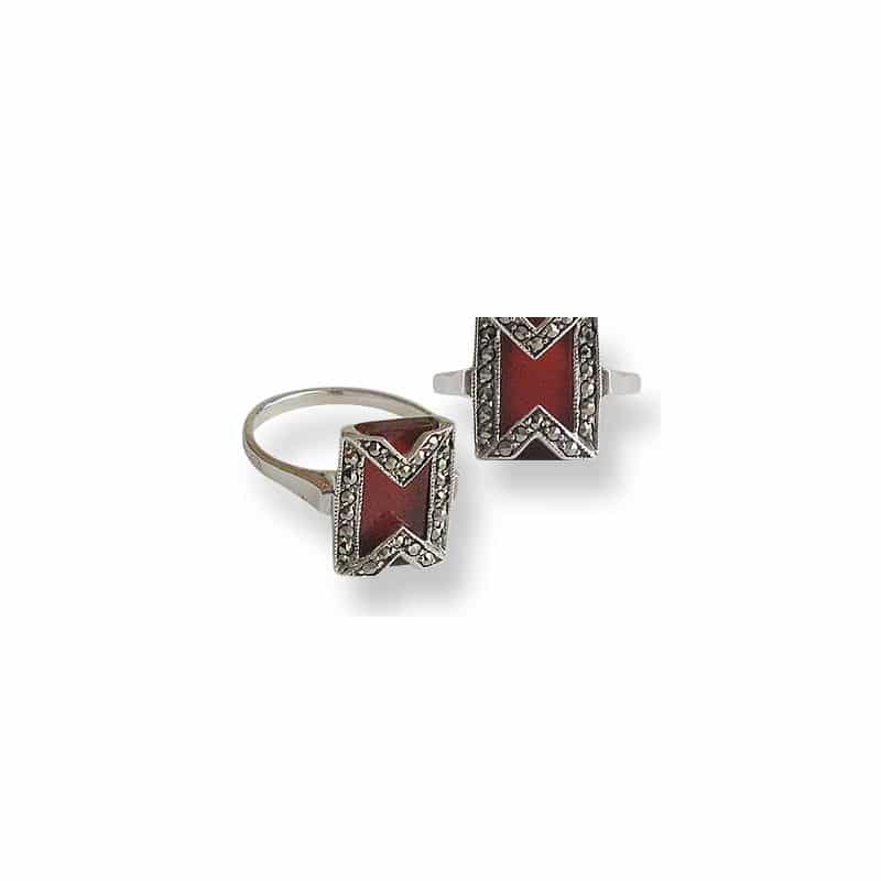 La cornaline est délicatement recouverte d’un ruban en fines marcassites, qui forme un élégant pli sur les petits côtés de la pierre.
