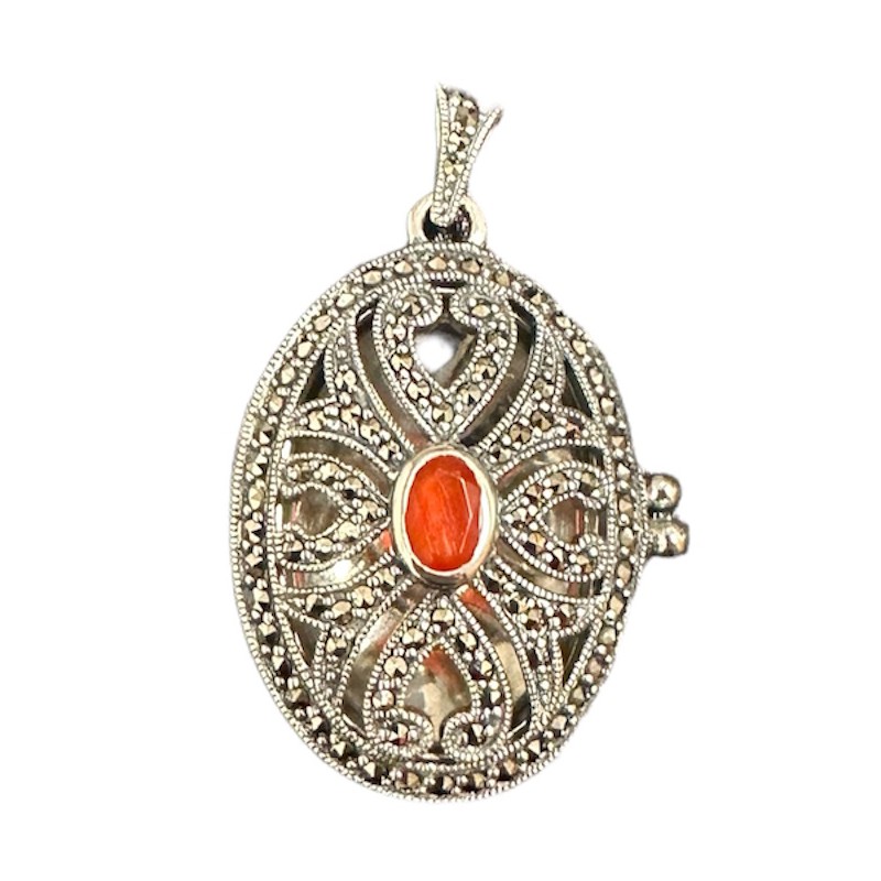 Ce magnifique pendentif “cassolette”, médaillon porte-photo qui s’ouvre grâce à une petite charnière, est orné en son centre d’un lumineux cabochon de cornaline. Ses motifs ajourés sont sertis de fines marcassites pour un rendu tout en légèreté.