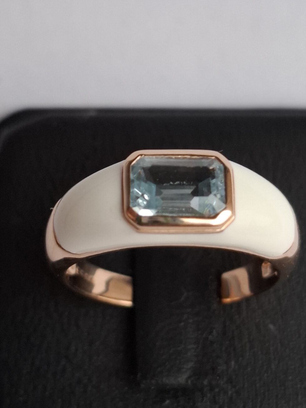 La pierre, taillée en rectangle et sertie clos, capte la lumière avec intensité et évoque la pureté des eaux cristallines. Son contour d’émaillage blanc apporte une touche de délicatesse, mettant en valeur l’éclat lumineux de la gemme. L’anneau, intégralement plaqué or rose, enveloppe le doigt d’une chaleur subtile et contemporaine.